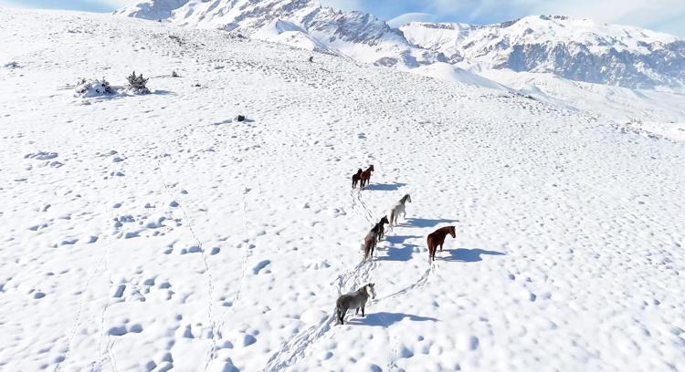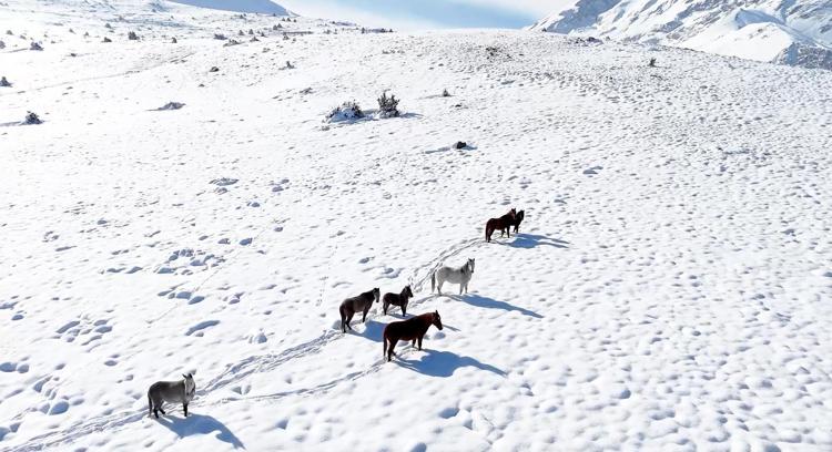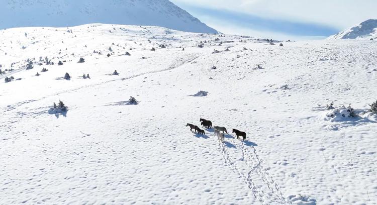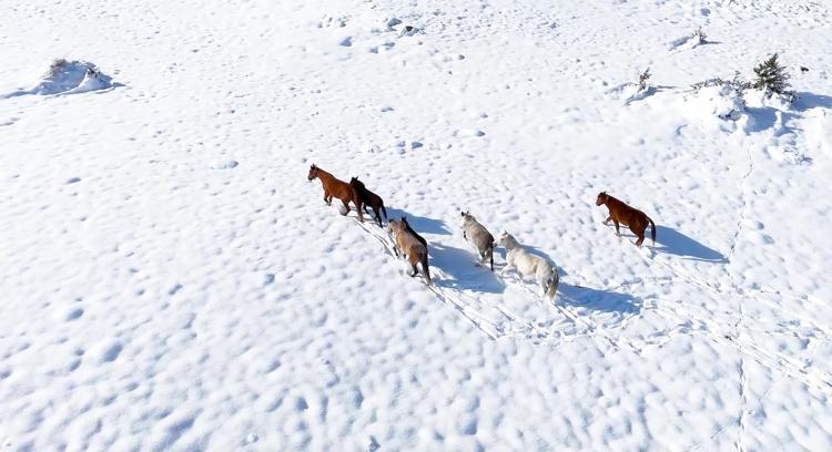 Karla kaplı bölgede gezen yılkı atları dron kamerasında