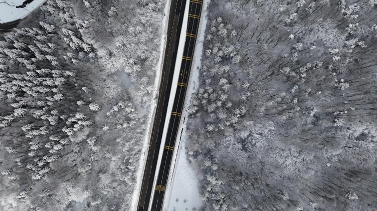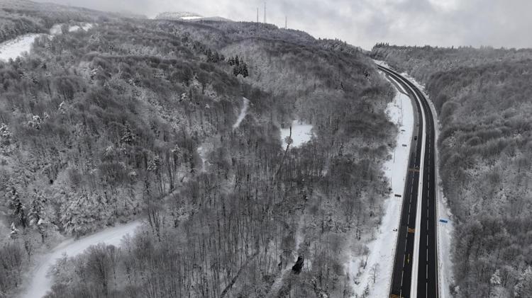 Bolu Dağı'nın D-100 kara yolu geçişinde aralıklarla etkili olan kar yağışının ardından yeşil alanlarda kar kalınlığı yaklaşık 10 santime ulaştı. Karla kaplı Bolu Dağı, dron ile görüntülendi.