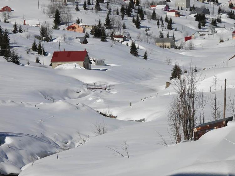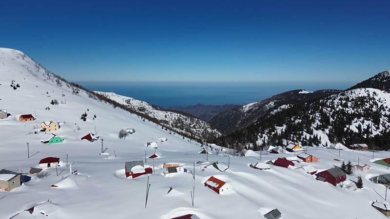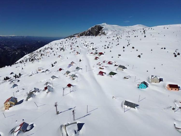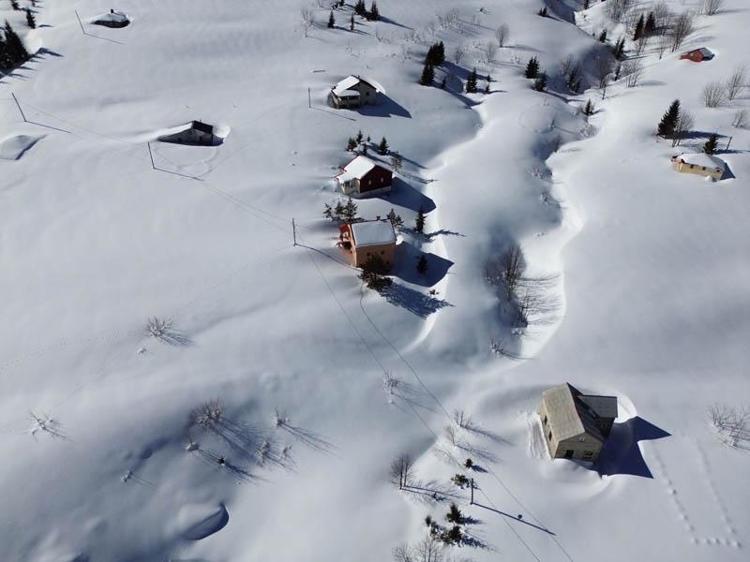 Karın evlerin boyuna ulaştığı yaylalarda ortaya çıkan görüntüler dron kamerasıyla görüntülendi.