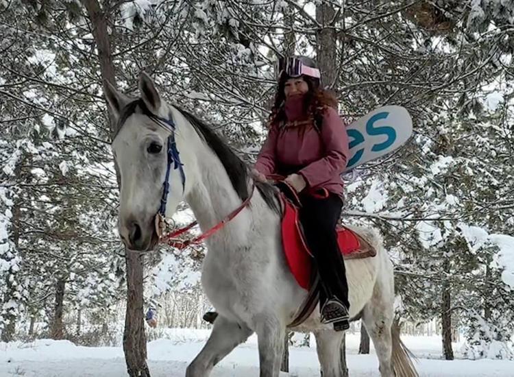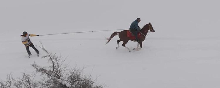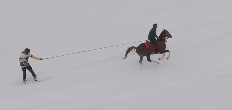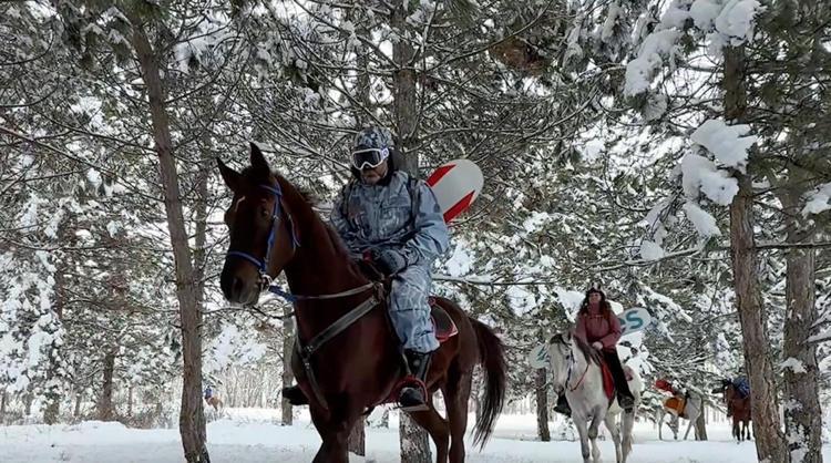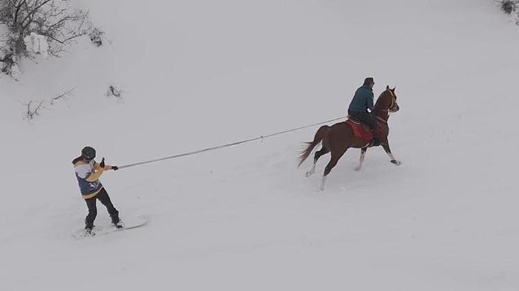 Karlı arazide önce safari, ardından atlarla snowboard keyfi