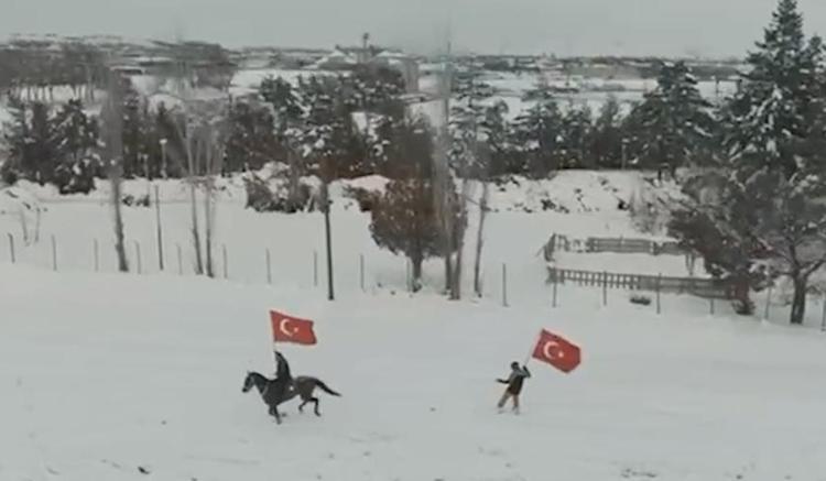 Erzincan’da bir grup snowboard tutkunu, kar kalınlığının 30 santimetreyi bulduğu arazide atlarla safariye çıktı. Beyaz örtüsüyle güzel manzara oluşturan ovada gezinti yapan grup, daha sonra yanlarında getirdikleri snowboardlarıyla farklı bir heyecan yaşadı. Atların arkasına bağlanan ipleri tutan gençler, ellerinde Türk bayraklarıyla snowboard yaptı.