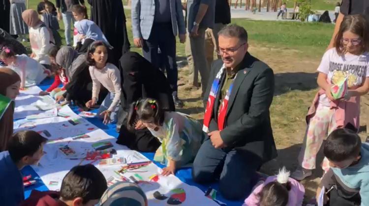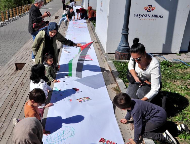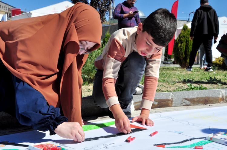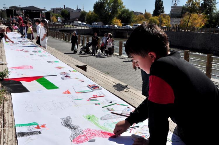 Kars ve Iğdır’da, İsrail'in Gazze'ye yönelik süren saldırılarını protesto etmek ve savaşın mağdur ettiği Filistinli çocuklara destek vermek amacıyla ‘Filistinli çocuklar için çiz’ etkinliği düzenlendi. Etkinliğe katılan çocuklar, yere serilen dev tuval üzerine Filistin bayrağı, barış sembolleri ve Gazze'ye destek mesajları çizdi.