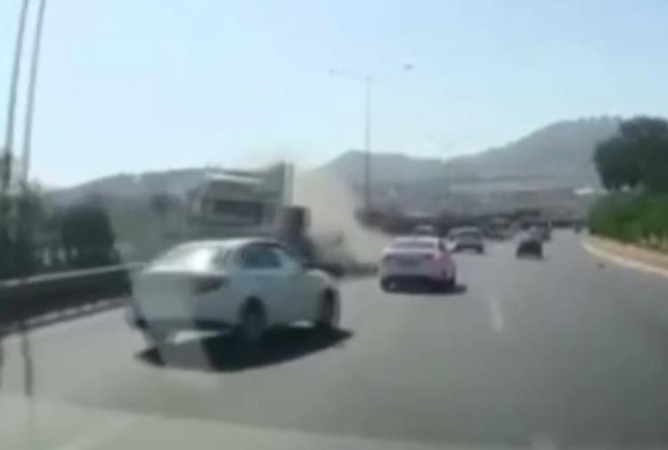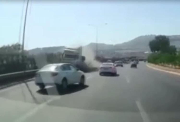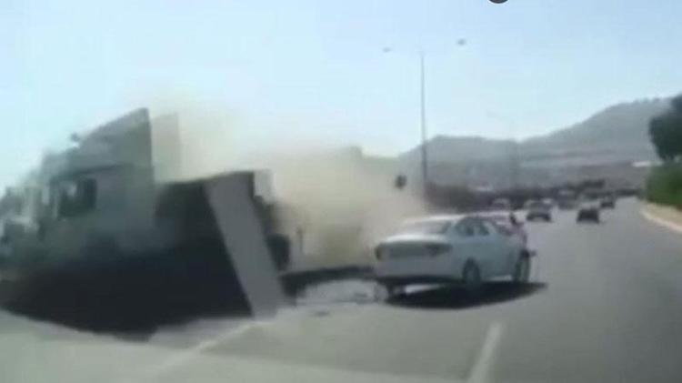 İzmir'de, lastiğinin patlaması sonucu refüjdeki demir bariyerleri aşıp karşı şeride geçen TIR'ı fark eden otomobil sürücüsü, son anda manevra yaparak kurtuldu. O anlar, başka bir aracın kamerasına yansıdı.