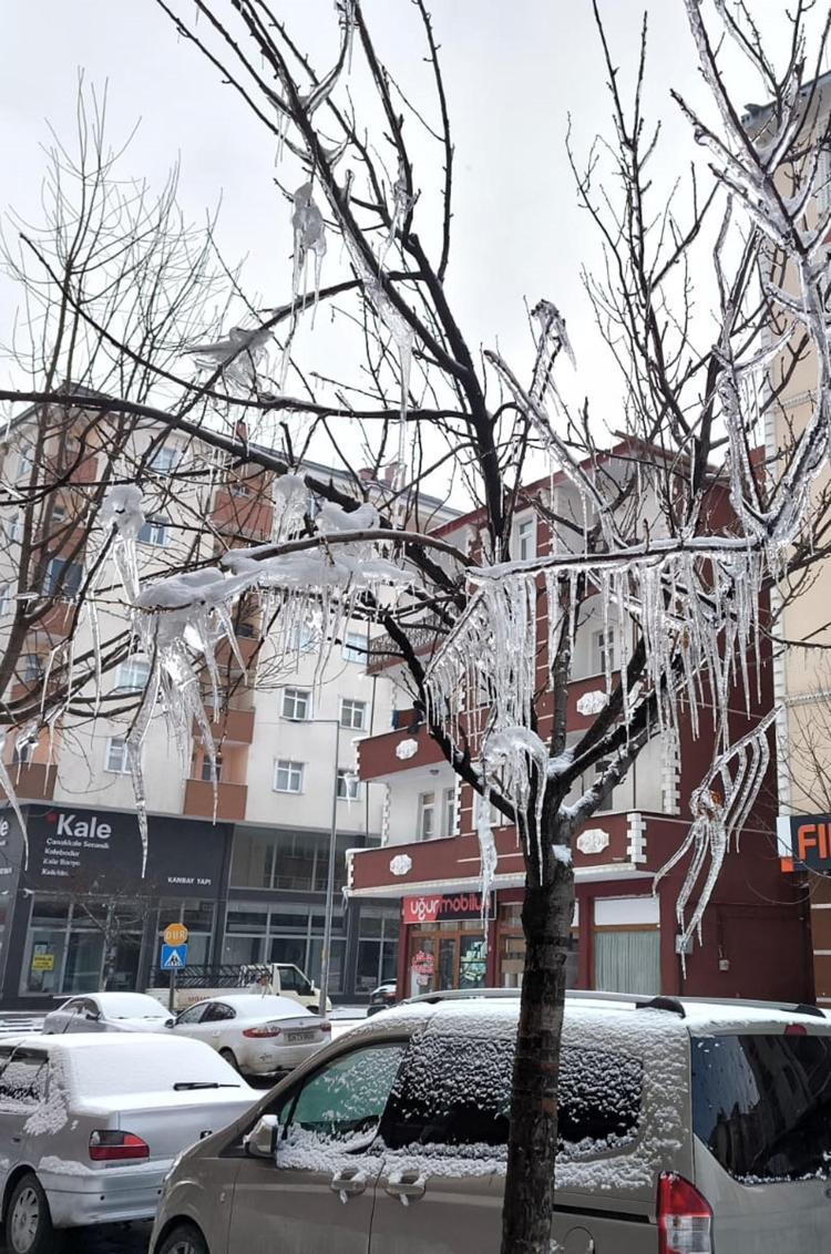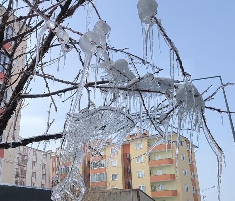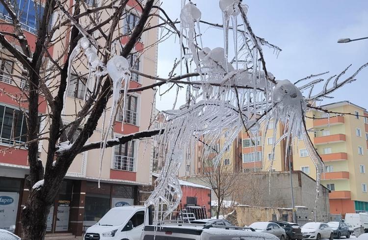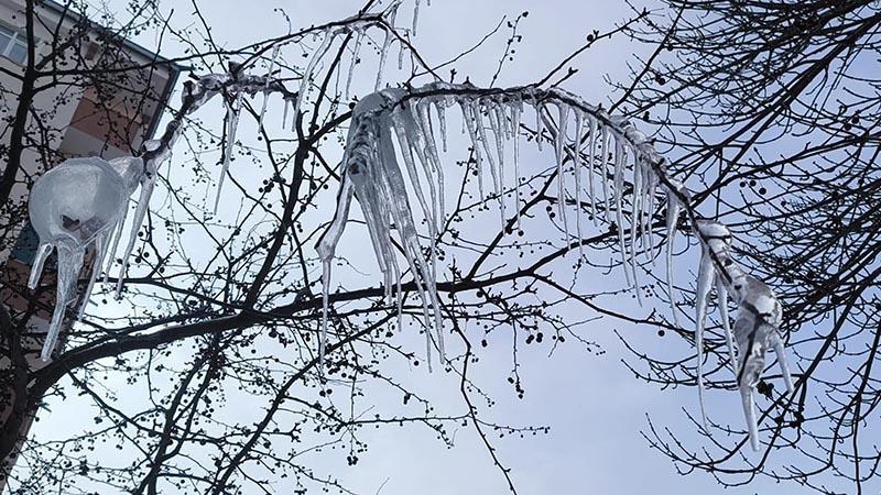 Kars'ta kar yağışı sonrası hava sıcaklığı aniden düşerken, ağaç dallarında buz sarkıtları oluştu.