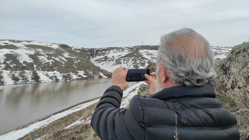 Kars’ta havaların ısınmasıyla birlikte eriyen kar suları, baraj gölünde şelale oluşturdu.