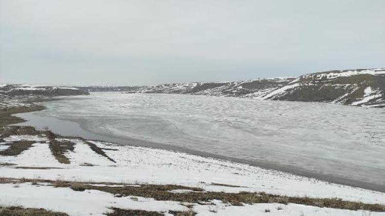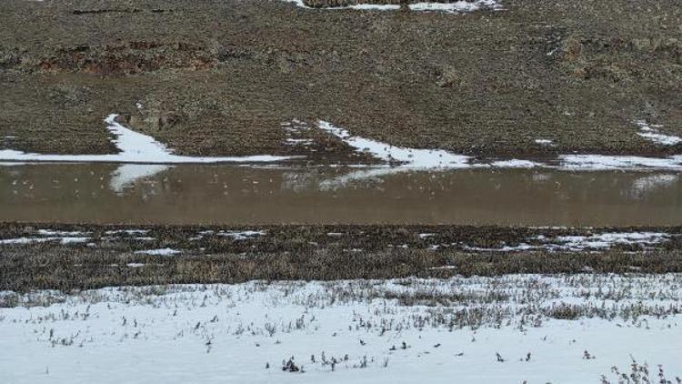 Kars'ın baraj bölgesinde havaların ısınmasıyla donan göletler, kısmen çözülmeye başladı.