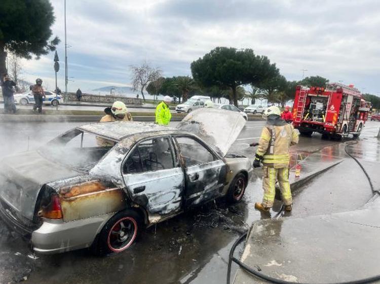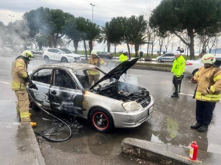 Kartal Sahil Yolu'nda giden otomobilde yangın çıktı. Araçtan inen sürücü ve küçük kızı son anda kurtuldu. Alev alev yanan otomobil cep telefonu kamerasına kaydedildi.