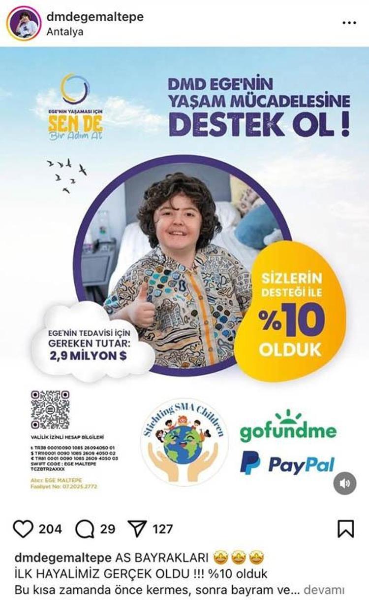 Dubai'ye gittik ve Ege'nin kanları alındı. 10 gün sonra sonuç geldi ve Ege tedaviye uygun bulundu. Bu haberle birlikte büyük bir umut doğdu içimizde. Yolumuz uzun çünkü tedavinin maliyeti 2,9 milyon dolar. Ege için başlatılan kampanya, şu anda yüzde 10 seviyesinde. Bu yılın sonuna kadar gerekli desteği toplayıp tedaviye başlayabiliriz diye umut ediyorum" diye konuştu.