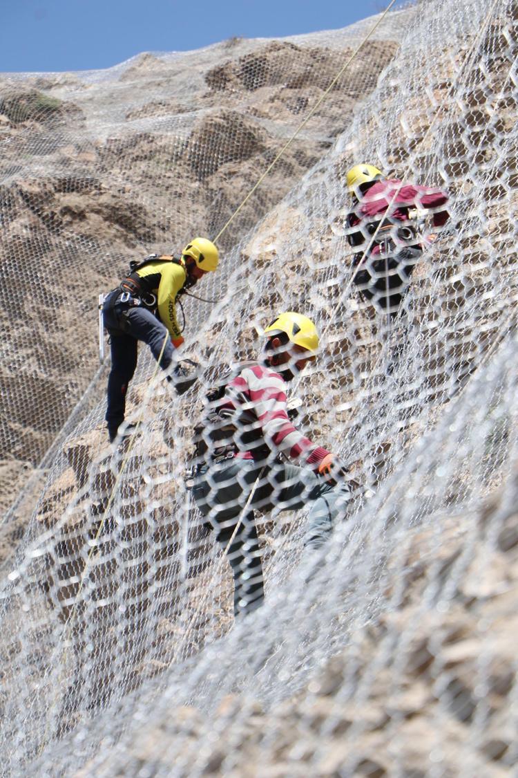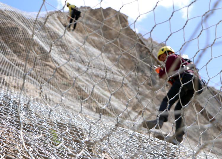 Tortum- Uzundere ilçeleri arasında geçen yıl başladığımız toplam 7 bin metrekare alanı bitirmek üzereyiz. Vinç yardımı ile dağın zirvesine taşıdığımız yaklaşık 3'er metre uzunluğundaki çelik tel balyaları aşağı doğru sarkıtıyoruz. Daha sonra belimize bağladığımız halat yardımı ile onları birbirine monte ederek aşağı iniyoruz. İlmek ilmek ördüğümüz çelik ağ sayesinde dağdan kopan kaya parçalarının yola düşmesini engelliyoruz.