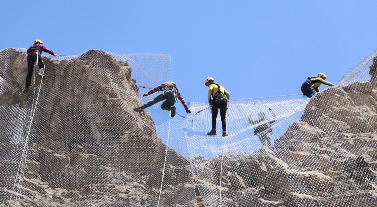 Tonlarca ağırlıktaki çelik tel balyaları vinçle 100 metreye varan yüksekliğe taşıyan işçiler, aşağı sarkıtılan tel örgüleri demirlerle kayalıklara sabitliyor.