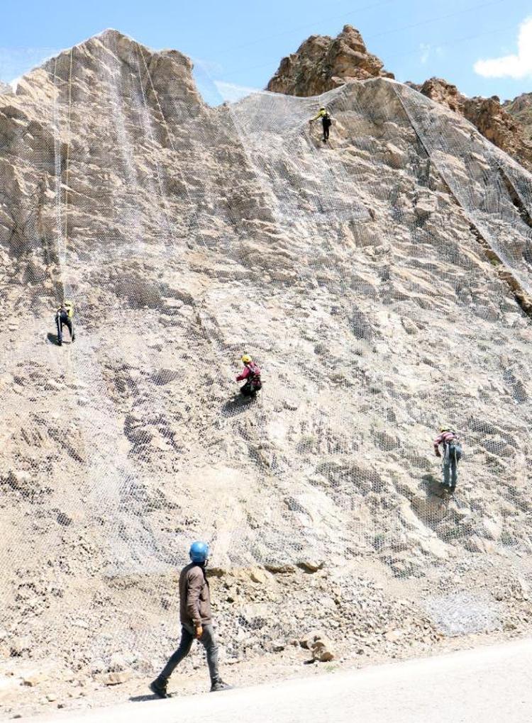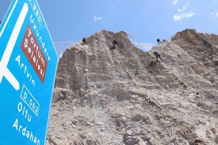 Dev kayaların yola düşmesi nedeniyle meydana gelebilecek kazaların önüne geçmek için Karayolları 12'nci Bölge Müdürlüğü'nce çalışma başlatıldı. İhaleyi alan firma belirlenen dağların yamaçlarını, çelik tellerle kapatıyor.