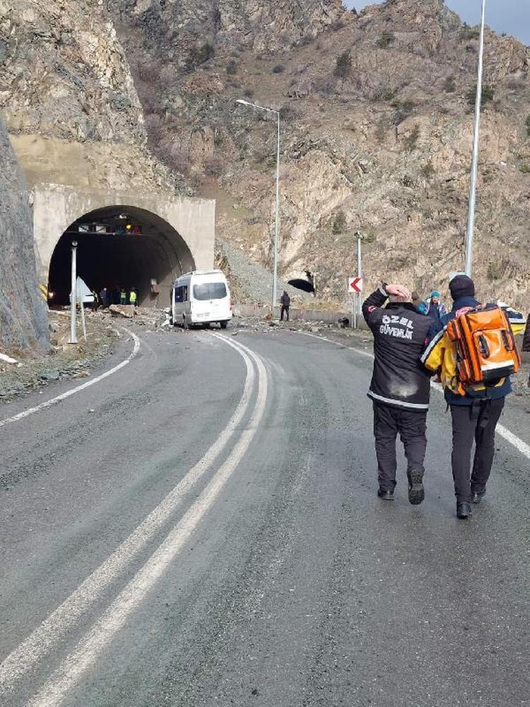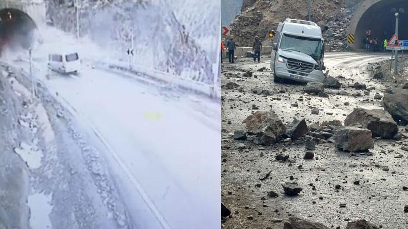 Görüntülerde; seyir halinde tünele girmek üzere olan minibüsün, önüne ve üzerine yamaçtan kopan irili ufaklı kayaların düşmesiyle durduğu, devasa kayanın da aracı teğet geçerek, hızla yola çarpıp sekerek uçuruma yuvarlandığı, çevreyi toz bulutu kapladığı görülüyor.