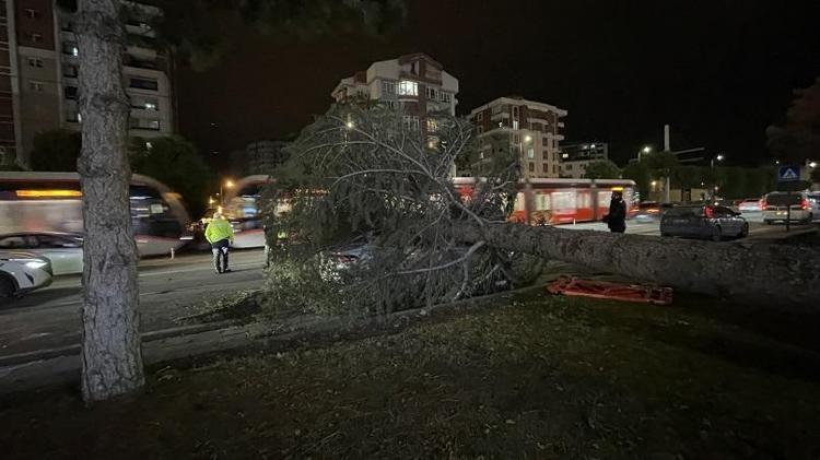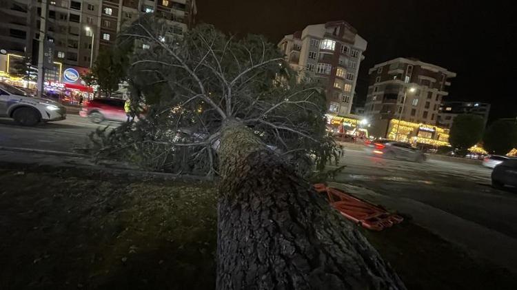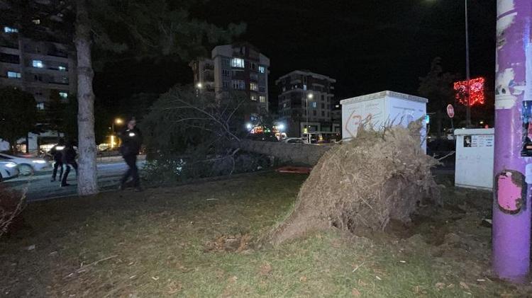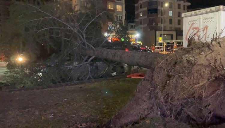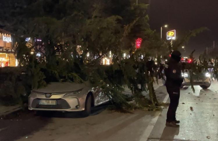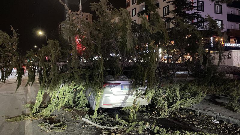 Kayseri'de, akşam saatlerinde başlayan kuvvetli fırtına nedeniyle devrilen ağacın altında kalan otomobilde hasar oluştu.