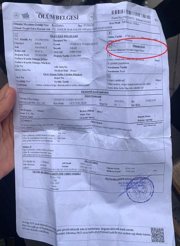 Adana'da 8 ay önce geçirdiği trafik kazası sonucu yaralanıp, tedavi gördüğü Adana Şehir Eğitim ve Araştırma Hastanesi'nde hayatını kaybeden Mahmut Aşar (26) için 'doğal ölüm' raporu verildi. Aile, raporun usulsüz düzenlendiğini ileri sürerken; hastane yönetimi konu ile ilgili inceleme başlattı.