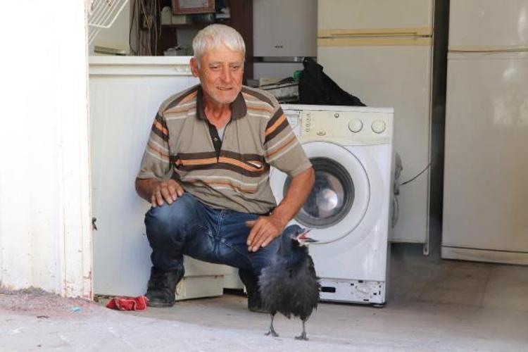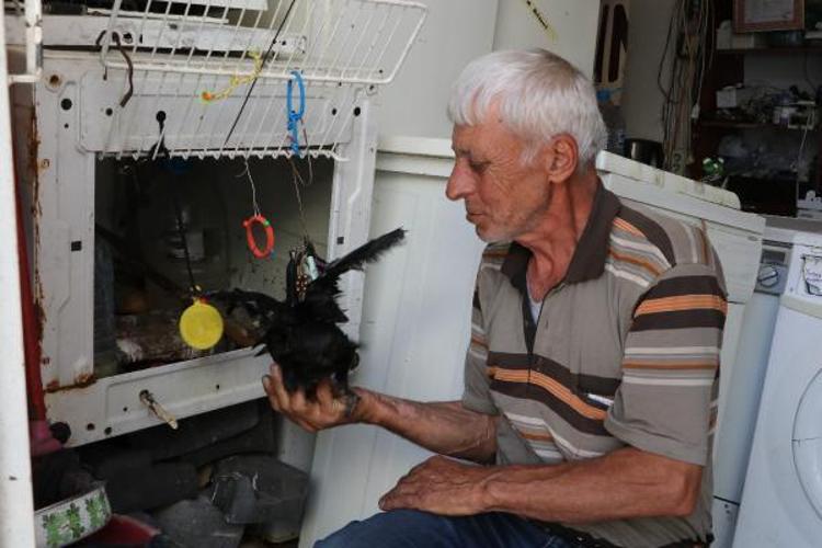 Kediden kurtardığı kargayı dükkanına getiren Yetim, eski çamaşır makinesinden bir yuva yaptı.