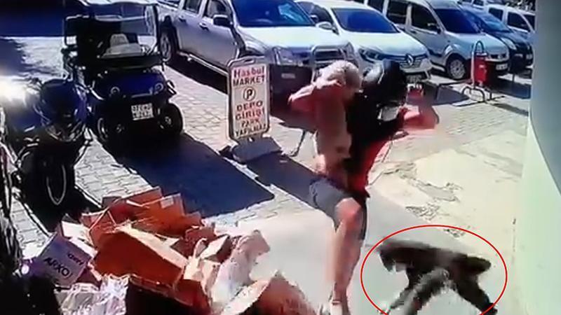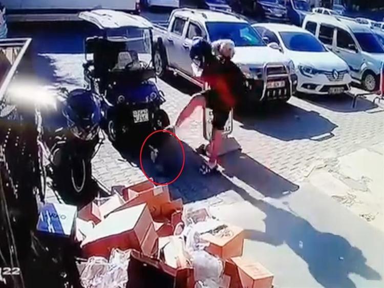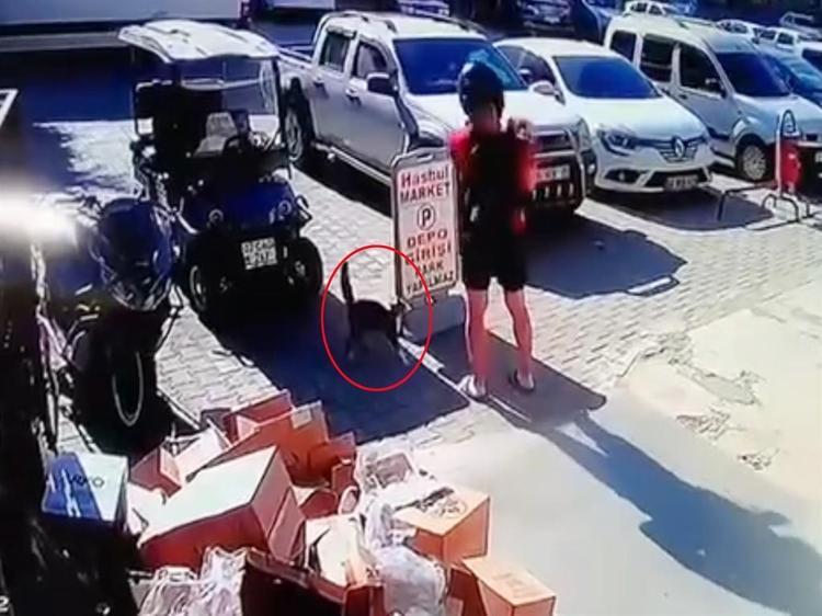 Güvenlik kamerasına yansıyan görüntüde, A.S.S.'nin motosikletiyle marketin önüne gelip, yanındaki köpeğiyle indiği görüldü. Bu sırada köpeğe yaklaşan kedinin saldırdığı, ardından A.S.S.'nin köpeği kucağına aldığı, sonra da kediyi 2 kez tekmelediği anlar görüntüde yer aldı.