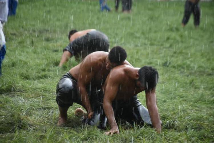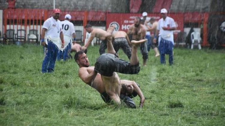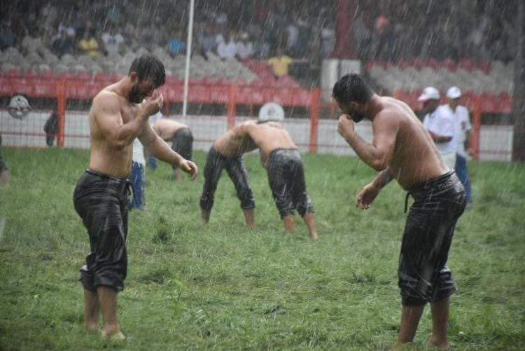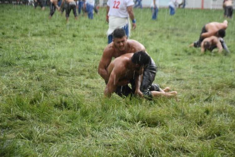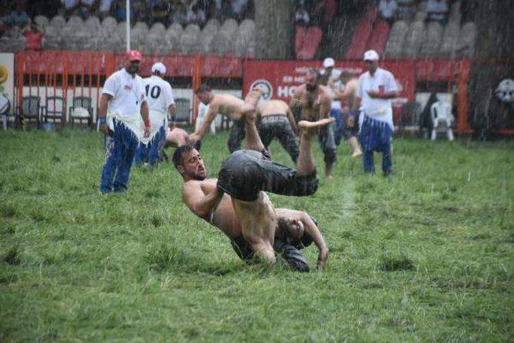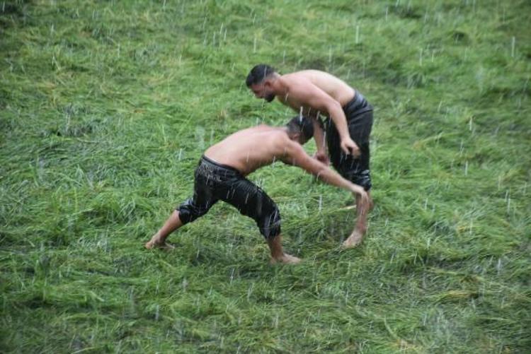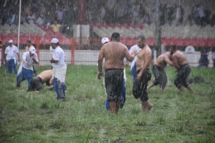 Edirne'de devam eden Kırkpınar Yağlı Güreşleri'ne verilen cuma namazı arasının ardından küçük orta küçük boylarının çayıra çıktığı sırada aniden yağmur bastırdı. Sağanağa yakalanan güreşçiler mücadeleye devam ederken, zor anlar yaşadı. Güreşler sırasında yağmur zaman zaman hızını arttırırken, pehlivanlar zorlu mücadelelerini sürdürdü. Sağanak, Er Meydanı'nda etkili olmaya devam ederken, hakemler yağmurluk giyerken güreşçileri yönetmeye başladı. Dualı çayırda güreşler yağmur altında devam ediyor. (DHA)