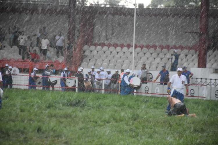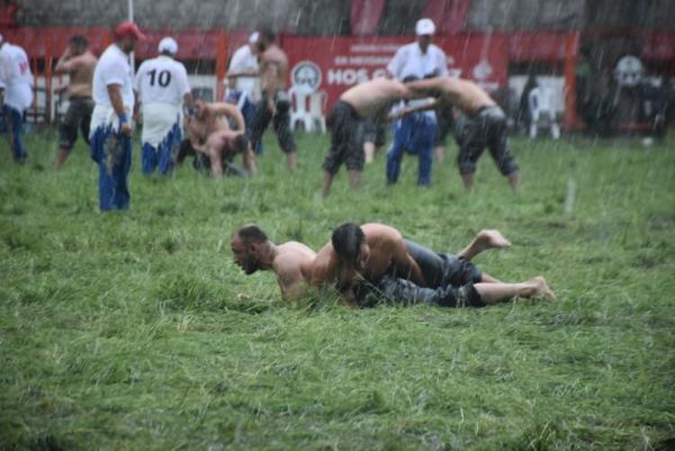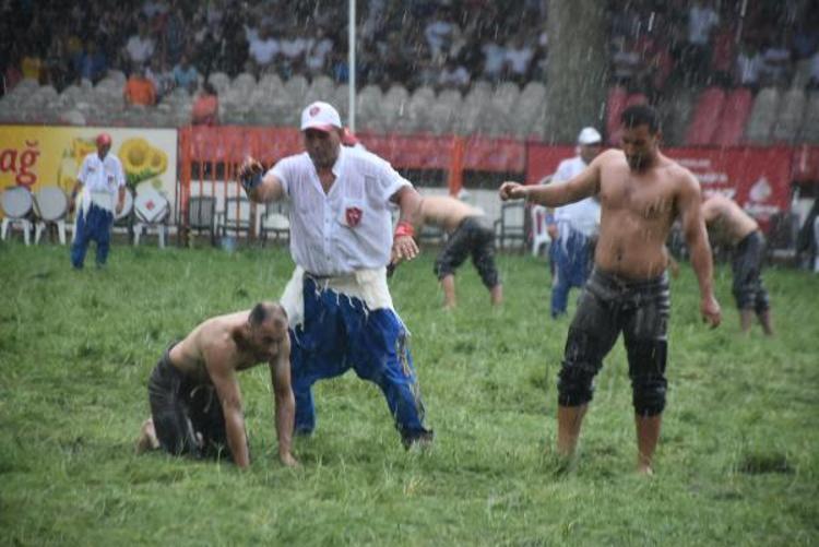 Edirne'de Sarayiçi Er Meydanı'nda süren Tarihi Kırkpınar Yağlı Güreşleri'nde, pehlivanlar aniden bastıran sağanak yağışa yakalandı.