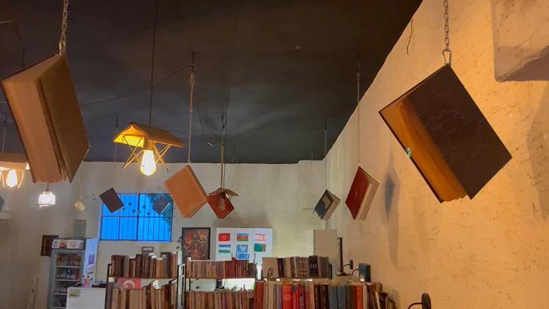 “Tadilatını yaparken, kitapları nasıl yerleştireceğimizi, nasıl bir atmosfer kuracağımızı düşünüyorduk. Bir arkadaşımız bununla ilgili, ‘Kitaplar günümüz teknolojisinde intihar ediyor’ diye bir metafor yapıp, ‘Kitapları asalım’ dedi. Ben de intihar edenleri asalım, kurtarabildiklerimizi raflara koyalım dedim. Daha sonrasında yavaş yavaş bir dekor oluşturduk. İhtiyaç duyduğumuzda, eşimle birlikte biriktirdiğimiz eski nesnelleri getirdik Evimizde olmayanları ise satın aldık.”
