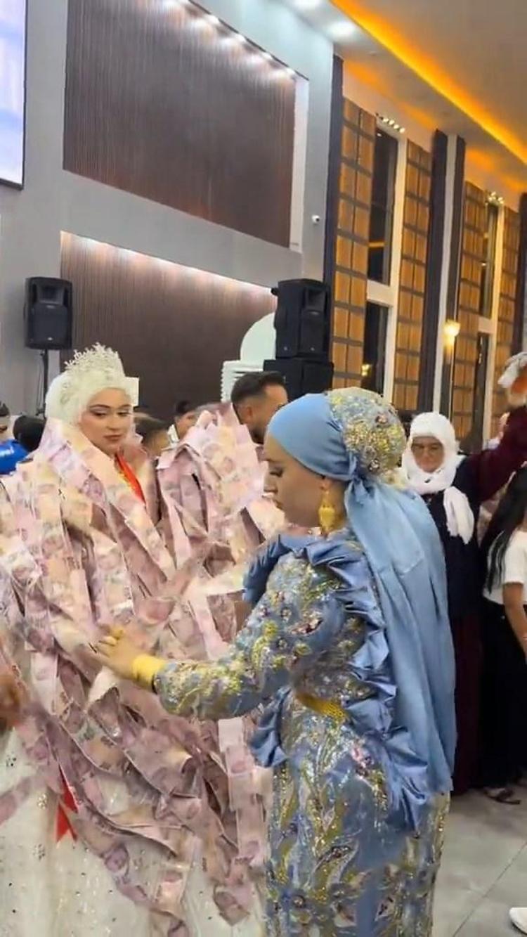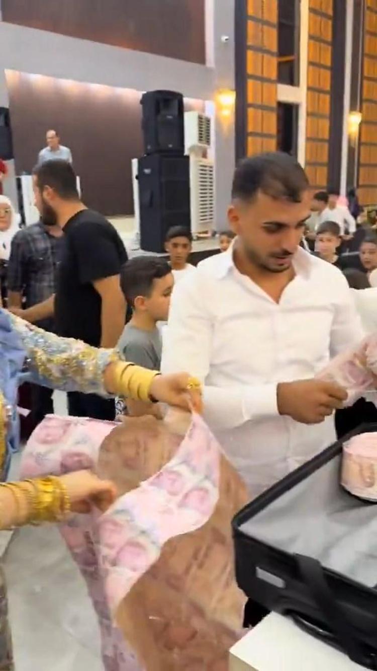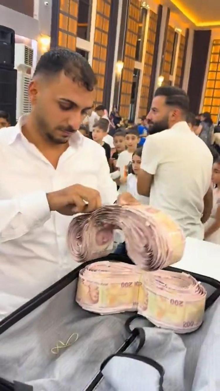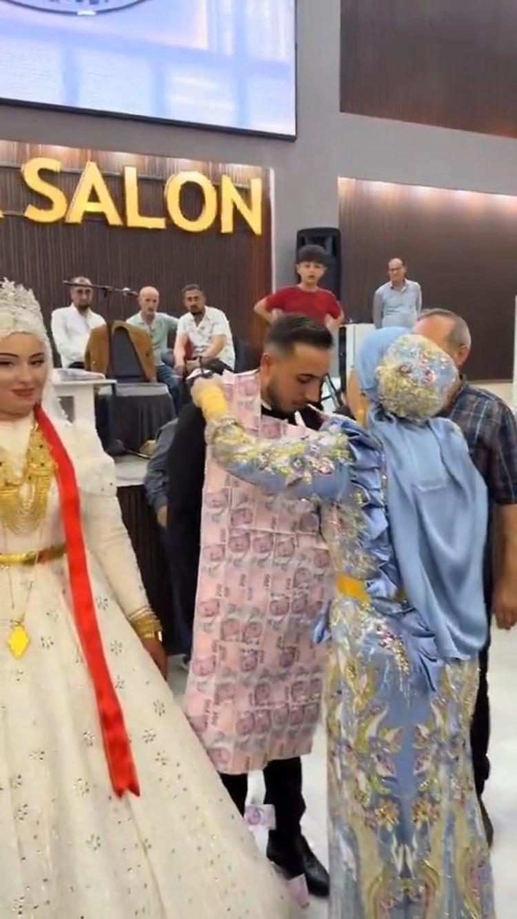 Kızıltepe ilçesinde yapılan bir düğünün takı töreninde damada valiz içerisinde getirilen 200 TL’lik banknotlardan oluşan yelek giydirildi. Atkı şeklinde hazırlanan diğer 200 TL’lik banknotlar da hem damada hem de geline takıldı. Gelin ve damadın üzeri banknotlarla kaplanırken o anlar cep telefonuyla görüntülendi. Sosyal medya platformlarında paylaşılan görüntüler ilgi gördü.