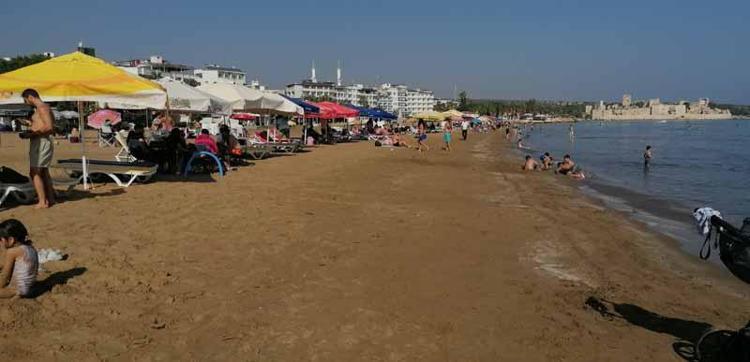 Mersin'de hava sıcaklıkları mevsim normallerinin üzerinde seyredince turistik Kızkalesi'nde sahiller doldu. Bazı kişiler güneşlenmeyi tercih ederken, bazıları ise denize girdi.