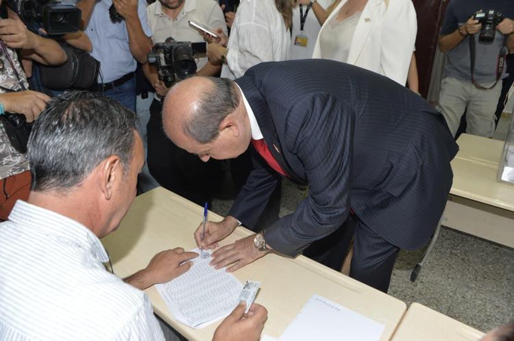 KKTC Cumhurbaşkanı Ersin Tatar, oyunu Lefkoşa Şehit Tuncer İlkokulu’nda 157 numaralı sandıkta kullandı.