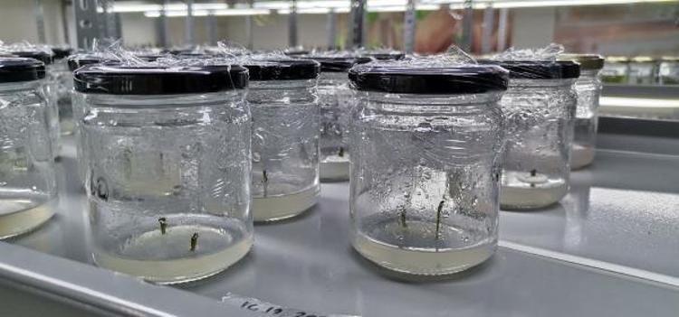Elde edilen ana bitkinin birebir kopyası olan bitkiler, iklimlendirme odasında kontrollü ışık ve sıcaklık koşullarında gelişimlerini tamamladıktan sonra üreticilere dağıtılabilecek fidanlar haline getiriliyor.