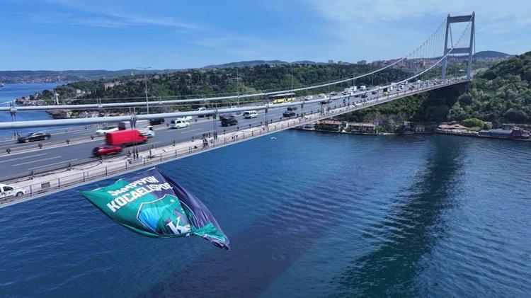 1’inci Lig’de 2024-2025 sezonunu birinci sırada tamamlayarak Süper Lig’e yükselen yeşil-siyahlı takımın dev bayrağı, Kocaeli Büyükşehir Belediyesi’nin gerekli izinleri almasının ardından bugün Fatih Sultan Mehmet Köprüsü’ne asıldı.