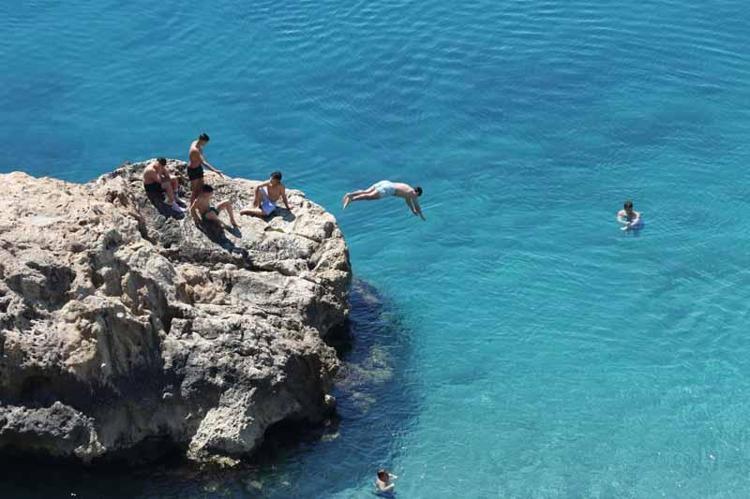 Konyaaltı Sahili'ne varyant tarafından giriş yapıldığında hemen falezlerin altındaki 6 metrelik kayanın üzerine çıkan gençler, tehlikeye aldırış etmeden kendilerini suya bıraktı. Sahil ve sahil bandında oluşan yoğunluk, dron ile de görüntülendi.