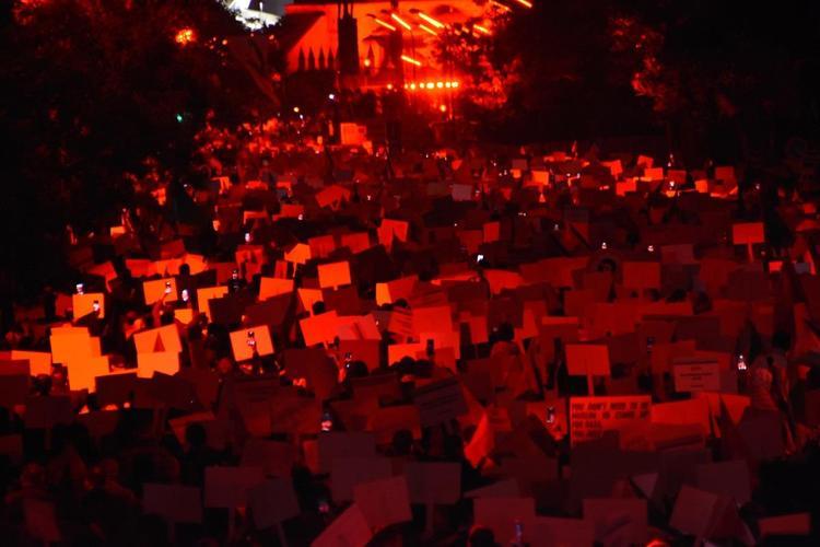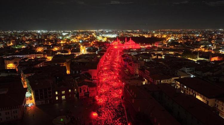 Kentin ana caddeleri ve meydanları yürüyüşe özel kırmızı ışıklarla aydınlatıldı. Mevlana Meydanı’nda 7 dakikalık oturma eylemi yapıldıktan sonra etkinlik sona erdi.