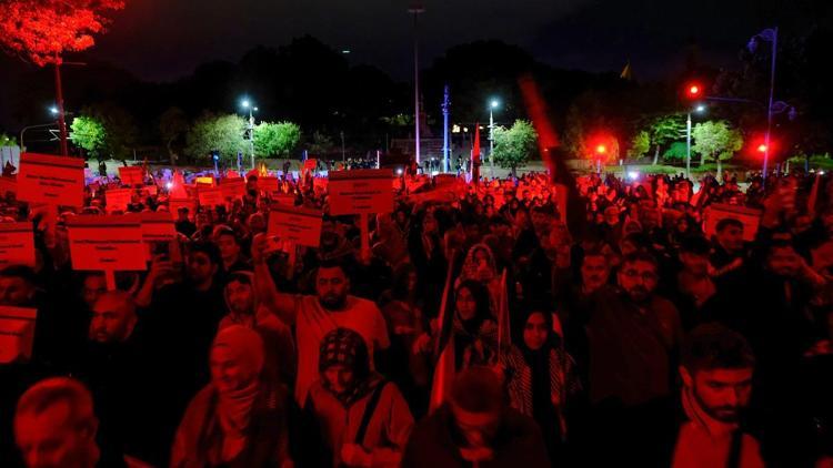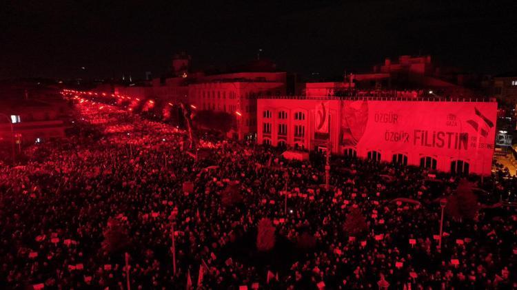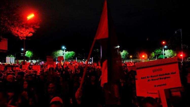 Yürüyüşe katılan on binler, üzerinde Gazze’de yaşamını yitirenlerin isimlerinin yazılı olduğu dövizleri taşıdı.
