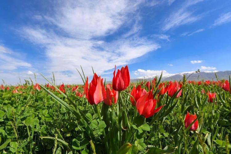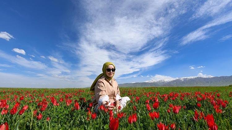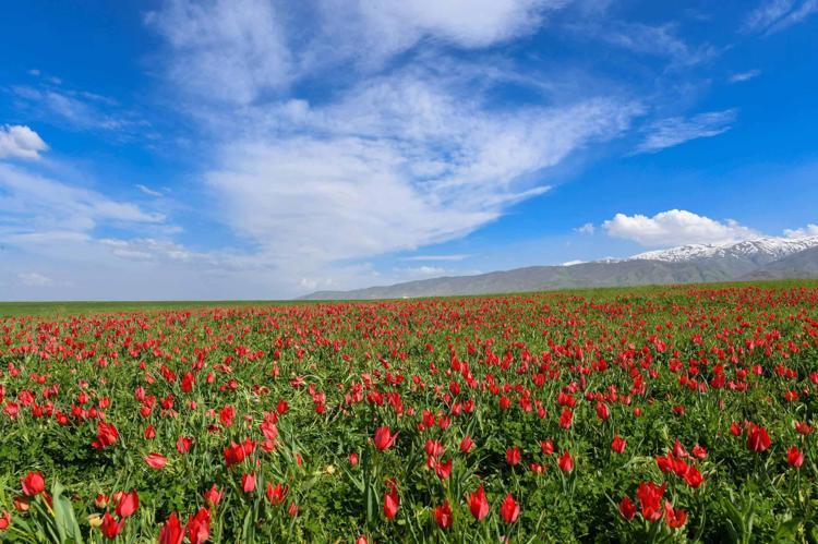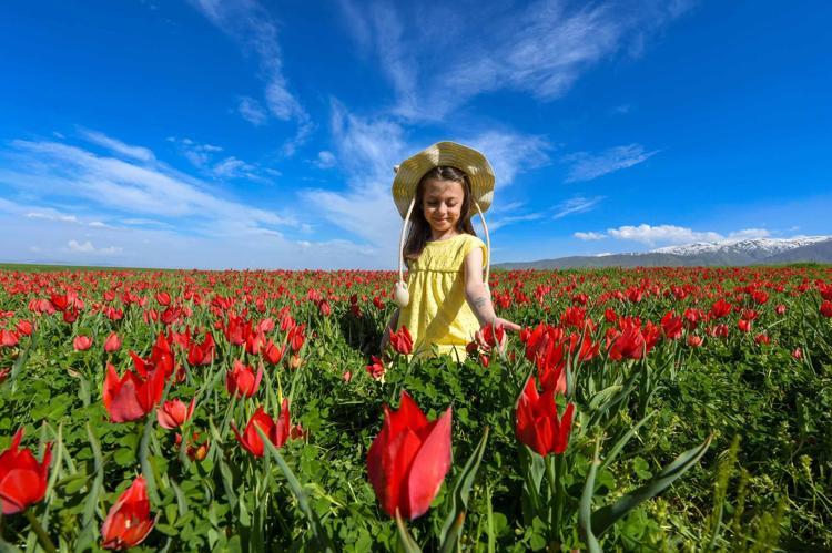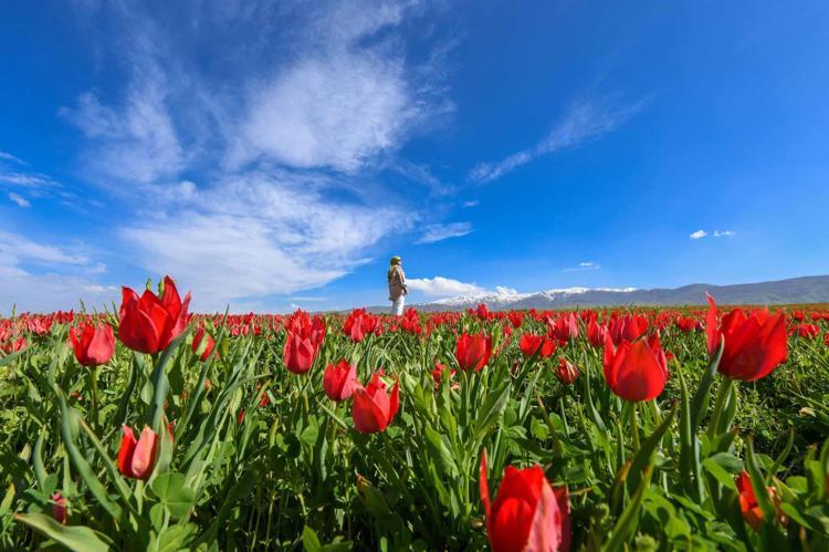 Türkiye'nin 3'üncü büyük ovasına sahip Muş'ta açan kırmızı mızraksı yapıya sahip laleler, seyrine doyumsuz manzaralar oluşturdu.