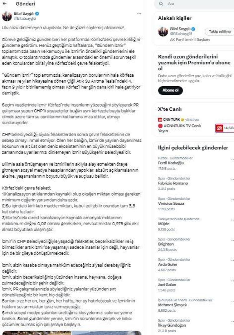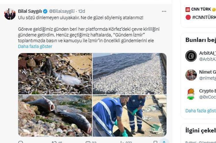 AK Parti İzmir İl Başkanı Bilal Saygılı, İzmir Körfezi Bayraklı Sahili'nde kıyıya vuran yüzlerce ölü balık ve kötü kokuyla ilgili sosyal medya hesabından açıklamada bulundu. Saygılı, "Ulu sözü dinlemeyen uluyakalır. Ne de güzel söylemiş atalarımız. Göreve geldiğimiz günden beri her platformda Körfez'deki çevre kirliliğini gündeme getirdim. Henüz geçtiğimiz haftalarda 'Gündem İzmir' toplantımızda basın ve kamuoyu ile İzmir'in öncelikli gündemlerini ele almıştık. O toplantımızda gündemler arasındaki en önemli sorun teşkil eden konulardan birisi yine Körfez'deki çevre felaketiydi.