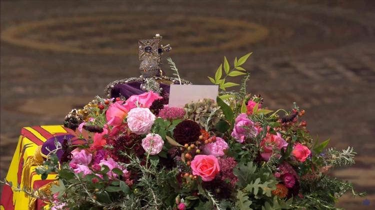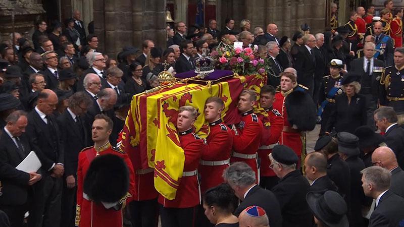 Törende ülke genelinde 2 dakikalık saygı duruşunda bulunuldu. Westminster Abbey’de düzenlenen törenin sonra ermesiyle birlikte Kraliçe’nin tabutu Wellington Arch’a (Wellington Kemeri) götürüldü. Buradaki geçit töreninin ardından Kraliçe’nin tabutu defnedileceği Windsor Kalesi’ne taşınmak üzere cenaze arabasına konuldu.