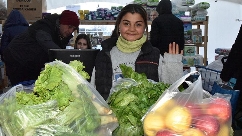 Deprem çadırı gönüllü görevlisi emekli zabıta amiri Ayla Büyükçetin, "Kızımızın getirdiklerinin listesi burada. Kızımız pazardan topladığı meyve ve sebzeleri teslim etti. Biz de onları kayıt altına aldık. Kendisine çok teşekkür ediyoruz. Gerçekten bugün arı gibi çalıştı" dedi.