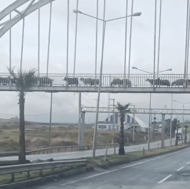 Şırnak’ın Cizre ilçesinde küçükbaşlar, üstgeçitten yolun karşısına geçti. O anlar, cep telefonu kamerasıyla kaydedildi.