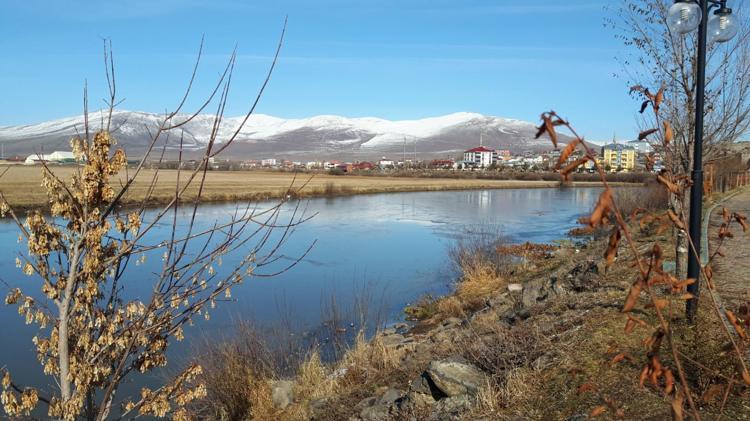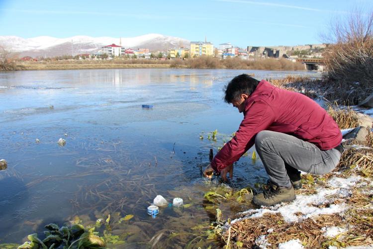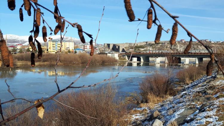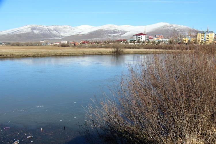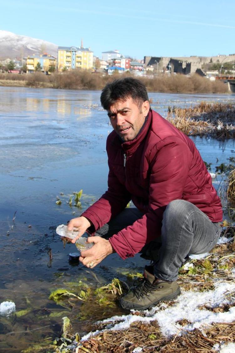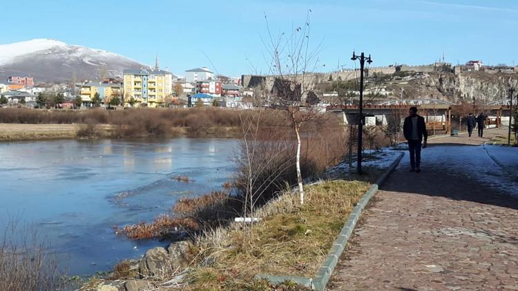 Ardahan'ın Göle İlçesi'nden doğan Kura Nehri, geceleri hava sıcaklığının sıfırın altında 10.4 dereceye kadar düşmesi sonucu buz tuttu.