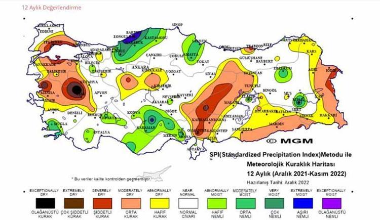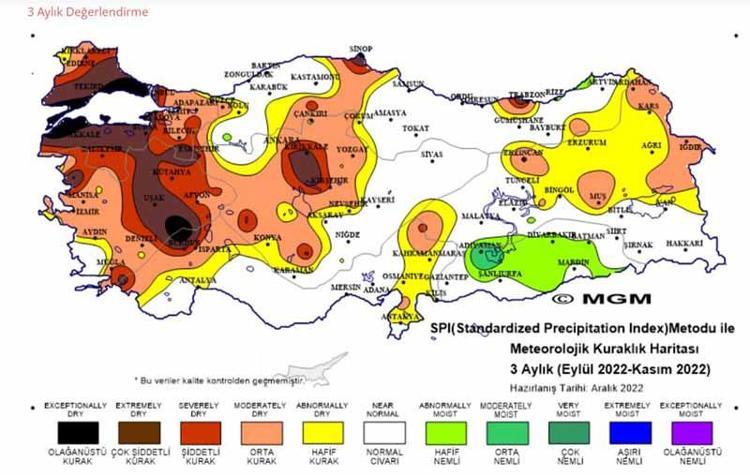 Meteoroloji Genel Müdürlüğü’nün 2022 yılı alansal kümülatif yağış raporuna bakıldığında, bölgedeki yağışlarda mevsim normallerine göre yüzde 25, 2021 yılı sonbahar mevsimi yağışlarına göre yüzde 17 azalma gerçekleşti.
