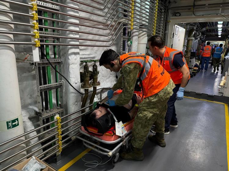 Senaryo gereği satha çıkma kabiliyetini yitirmiş denizaltında mahsur kalan kazazedelerin serbest çıkışı için çalışma yapıldı. İlk olarak 'TCG Alemdar' gemisinden, uzaktan kumandalı su aracıyla (ROV) denizaltının yeri tespit edildi. 35 metre derinlikteki personel serbest çıkış faaliyetini gerçekleştirdikten sonra kurtarma ekibi tarafından bota alınıp, 'TCG Alemdar'a intikal ettirildi. Kazazedeler, sağlık durumlarına göre yüzer hastaneye dönüştürülen 'TCG Alemdar' gemisindeki basınç odası, ameliyathane ve ara kablo yoğun bakım odasına alındı. Burada uzman ekipler, kazazedelere müdahale etti. Durumu ağır olan kazazedelerden 1'i, geminin güvertesine indirilen helikopterle tam teşekküllü hastaneye götürüldü. Paraşütle Arama Kurtarma (PAK) Timi de uçaktan paraşütle atlayarak kazazedeleri sudan çıkardı. Kurtarma ekipleri, kazazedeleri can sallarına alıp, ilk yardım uyguladı. Su yüzeyindeki kurtarma ekibi tarafından bota alınan kazazedeler, TCG Alemdar gemisine nakledildi.