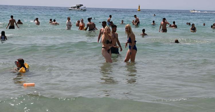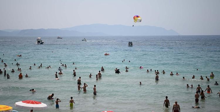 Hava sıcaklığının 35, deniz suyu sıcaklığının 28 dereceye ulaştığı ilçede, yerli ve yabancı turistler güneşli havayı fırsat bilip, sahillere koştu.