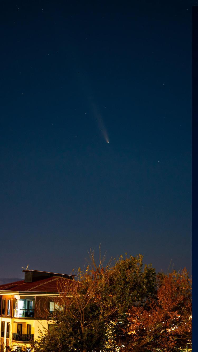 Kuyruklu yıldız şehrin meydana getirdiği ışık kirliliği dolayısı ile çıplak gözle çok zor gözükmektedir. Net görüntüleme için Tekirdağ’ın yüksek noktalarından birisi olan Büyükşehir Belediye Başkanlığı binası civarından özel ekipmanlı fotoğraf makinem ile kuyruklu yıldızı Tekirdağ şehrimiz ile birlikte görüntülemeyi başardım" diye konuştu.