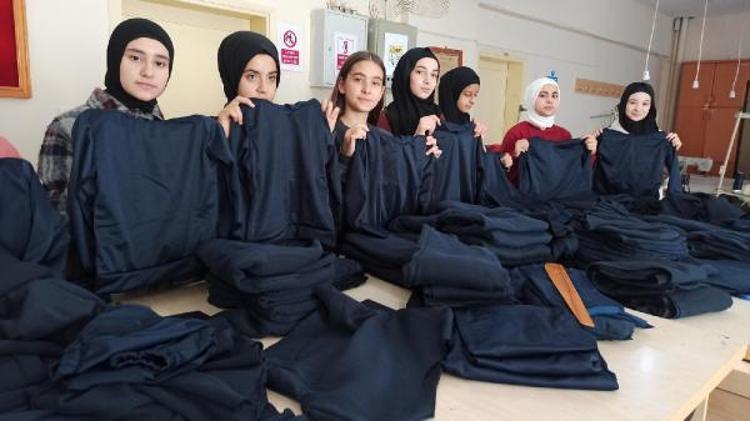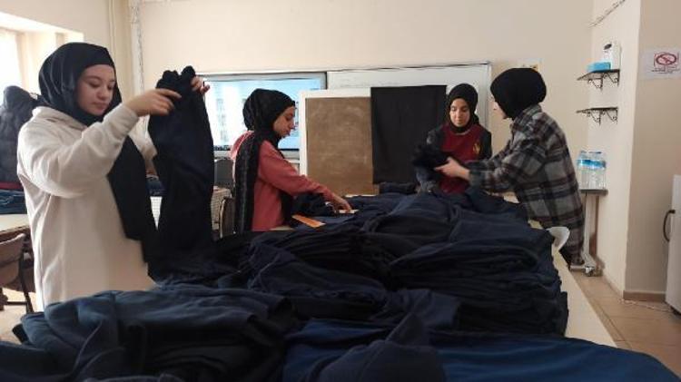 Kendileri de birer depremzede olan öğrenciler, özellikle felakette anne ve babalarını kaybeden, konteynerlerde yaşayan afetzedeler için eşofman takımı dikip, kukla yapıyor.