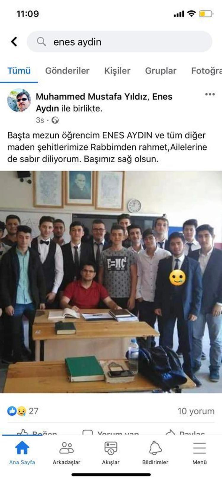 Amasra’nın Aşağıdere Köyü’nden Enes Aydın’ın öğretmeni Muhammet Mustafa Yıldız da “Başta mezun öğrencim Enes Aydın ve tüm diğer maden şehitlerimize rabbimden rahmet, ailelerine de sabır diliyorum. Başımız sağ olsun” ifadelerini kullandı.