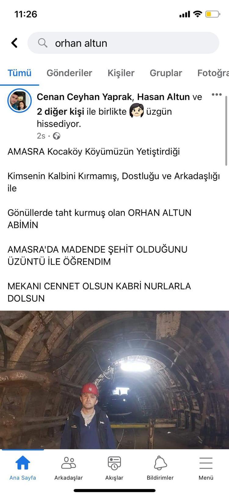 Amasra’nın Kocaköy Köyü’nden Orhan Altun’un arkadaşı ise vefat haberini “Kimsenin kalbini kırmamış, dostluğu ve arkadaşlığı ile gönüllerde taht kurmuş Orhan Altun abimin Amasya’da madende şehit olduğunu üzüntüyle öğrendim. Mekanı cennet olsun kabri nurlarla dolsun” ifadeleriyle paylaştı.