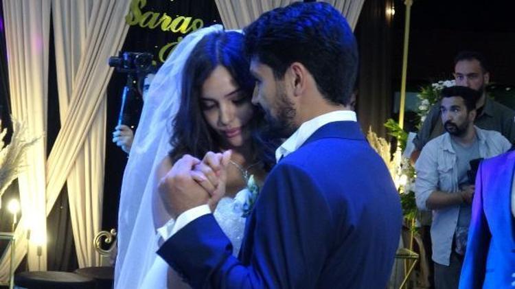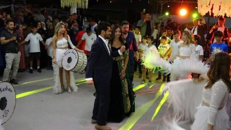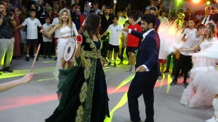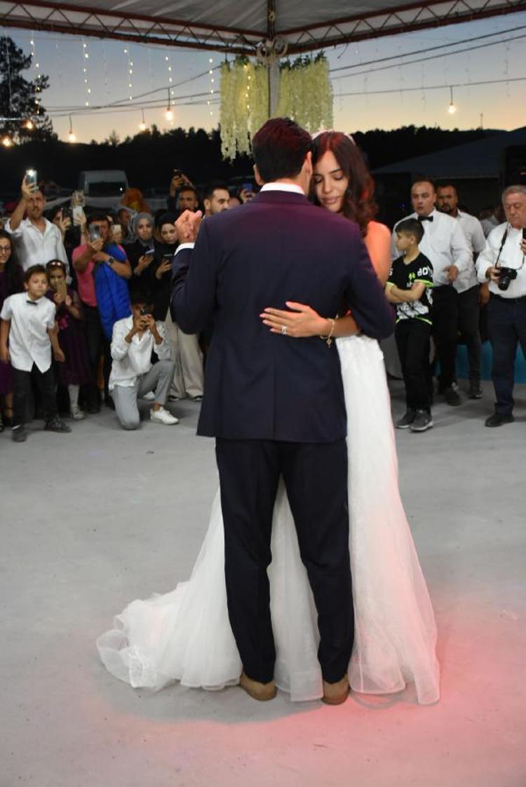 Yüzlerce kişinin katıldığı törene gelen çift, alkışlar eşliğinde sahneye çıkarak dans etti.