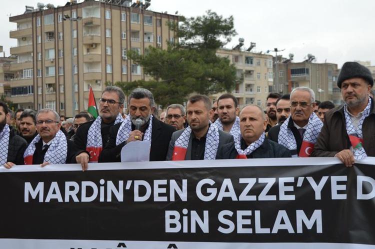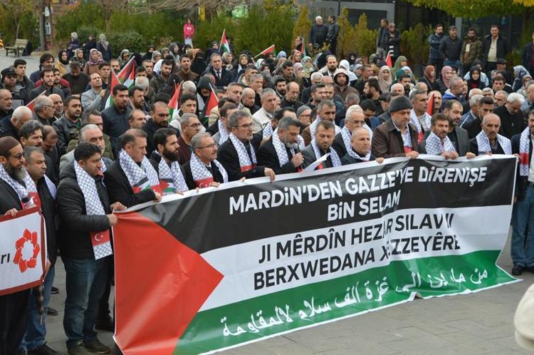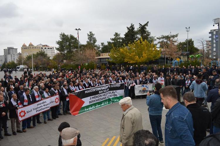 İsrail’in, Gazze'ye sürdürdüğü saldırılar nedeniyle Mardin’de faaliyet yürüten 60’a yakın sivil toplum kuruluşunun oluşturduğu Mardin Sivil Toplum Kuruluşları Platformu üyeleri, Şakir Nuhoğlu Camii önünde toplanarak İsrail'i protesto etti. Eyleme katılanlar, sık sık 'Mardin’den Gazze'ye direnişe bin selam’ sloganları attı. Dua ile sona eren basın açıklamasını platform sözcüsü Necmettin Başboğa okudu.