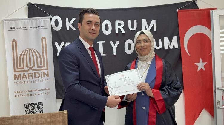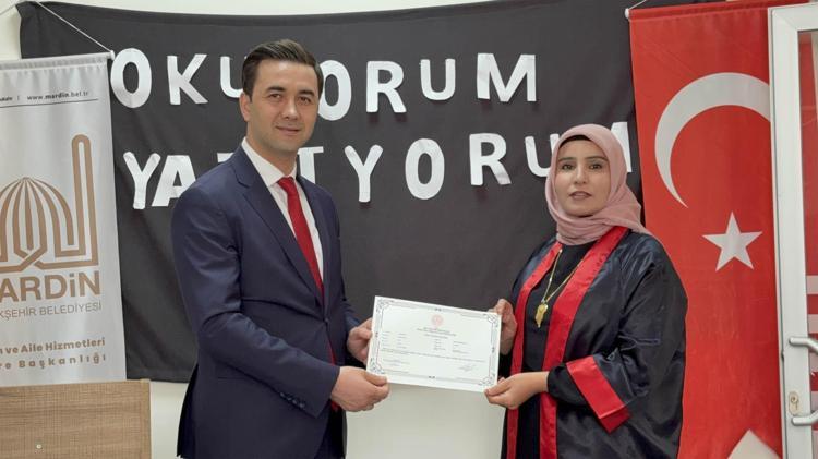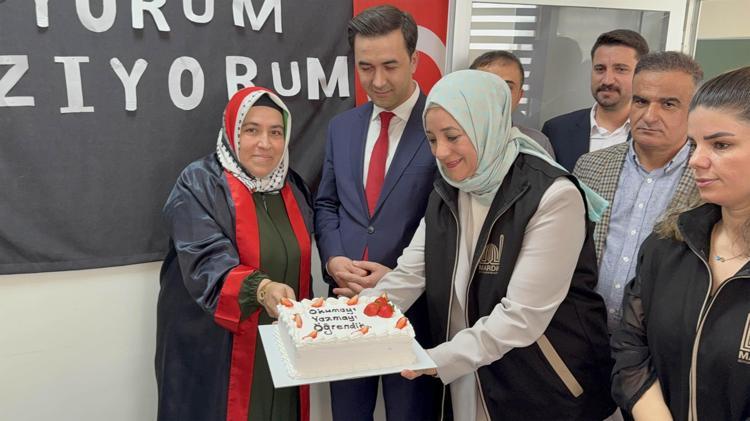 Mardin’in Midyat ilçesinde, Kaymakamlık, Büyükşehir Belediyesi ve İlçe Milli Eğitim Müdürlüğü iş birliğiyle açılan okuma yazma kursunu tamamlayan 15 anne, cübbe giyip sertifikalarını alarak mezuniyet sevincini yaşadı.