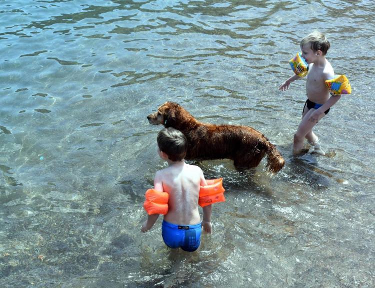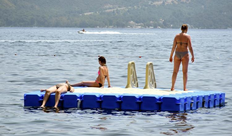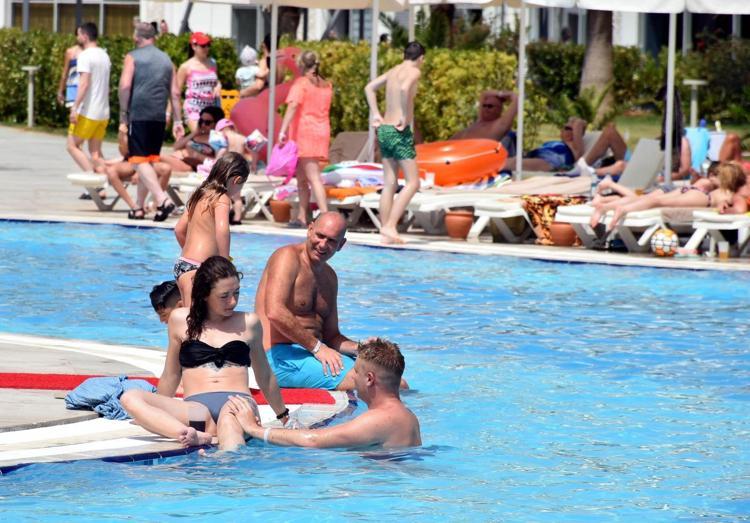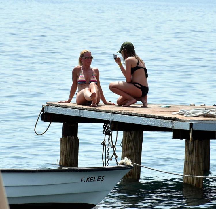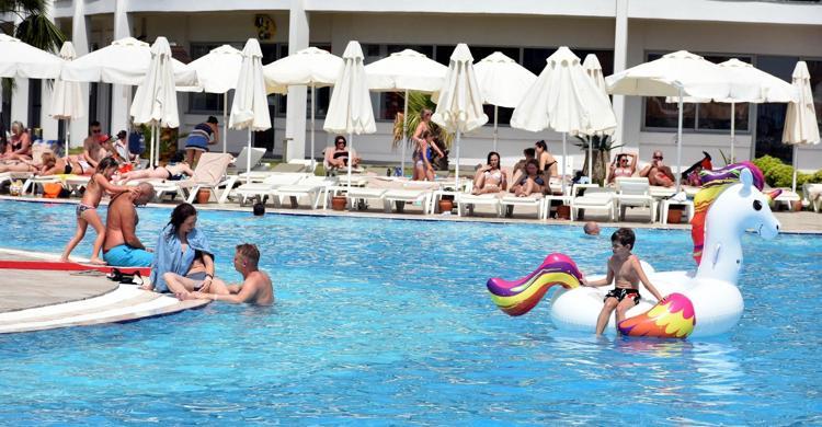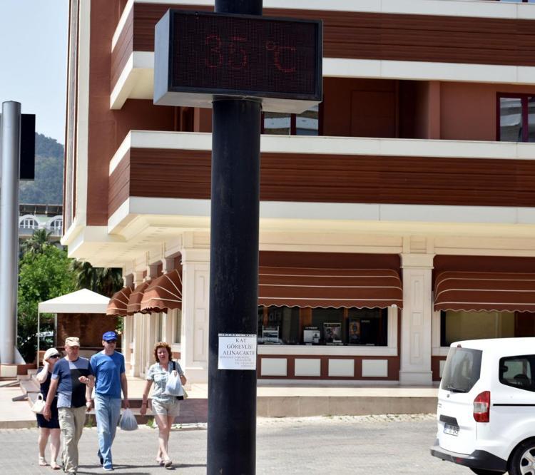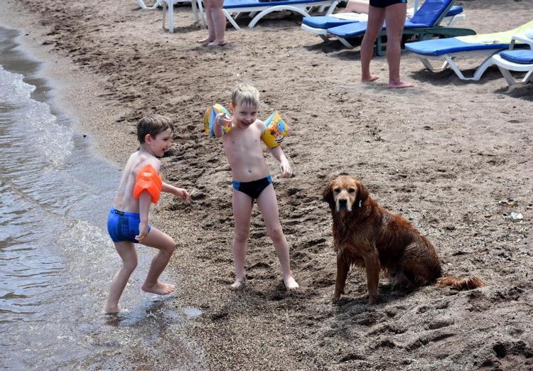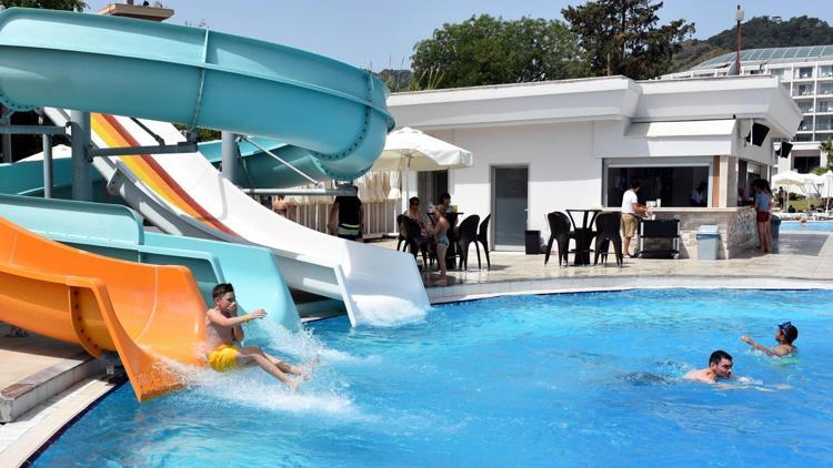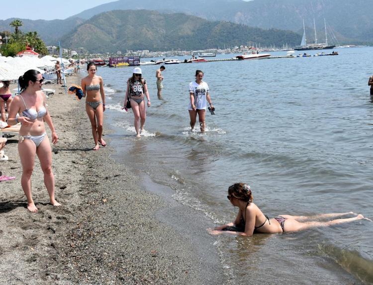 Marmaris'te hava sıcaklığı 35 dereceyi bulurken, ilçe sakinleri ve turistler sahillerle plajları doldurdı. Bazı kişiler şemsiye altında dinlenmeyi tercih ederken, çocuklar, köpekleriyle denize girerek oyunlar oynadı.