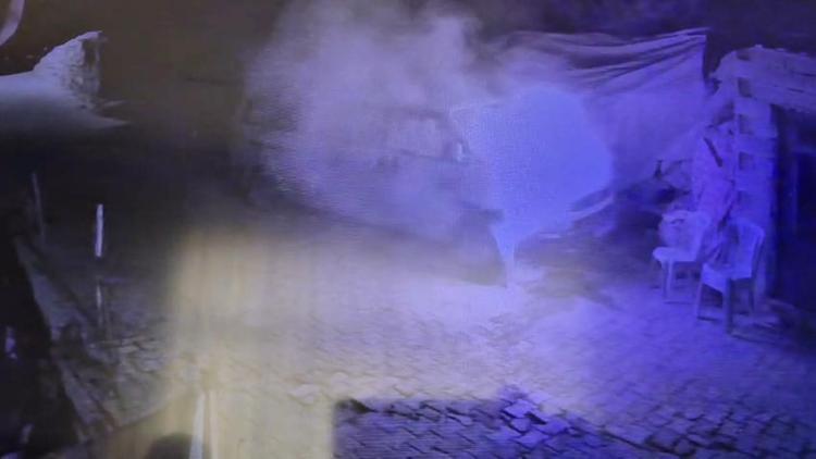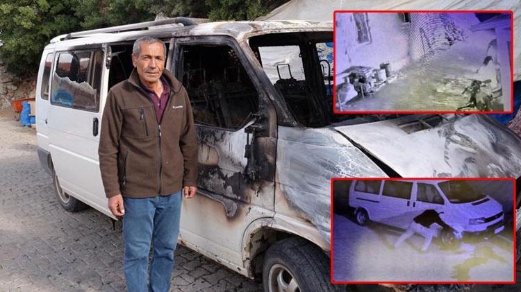 Olay anı, evdeki güvenlik kamerasına yansıdı. Görüntüde, yüzünde maske olan şüphelinin dağ tarafından biri sırtında iki bidonla geldiği, önce evin bir tarafındaki araçların üzerine yanıcı madde dökerek ateşe verdiği, ardından evin arkasından dolanıp bu kez de diğer taraftaki minibüsü ateşe verdiği görüldü. Araçların yanmasını bekleyen şüphelinin hızla uzaklaştığı anlar görüntülerde yer aldı.