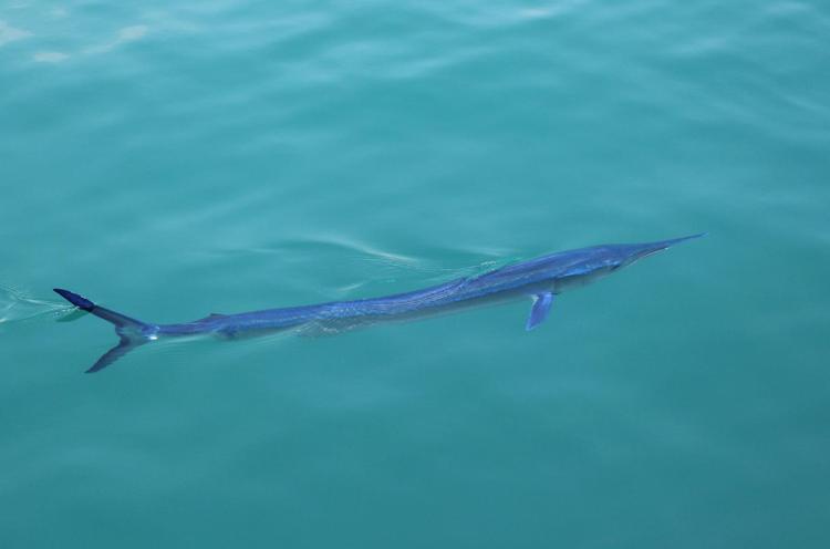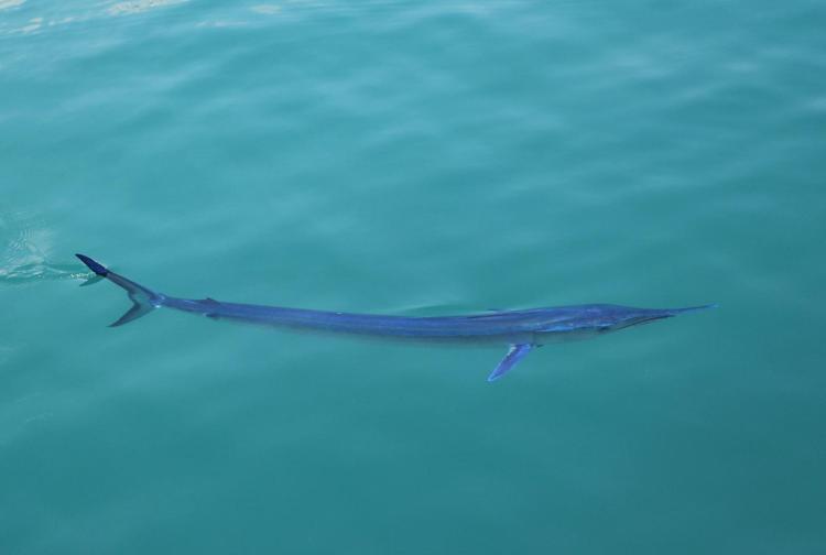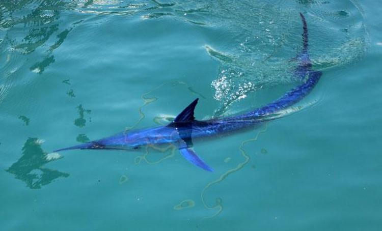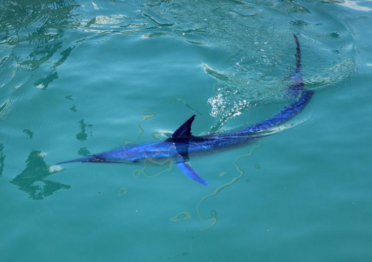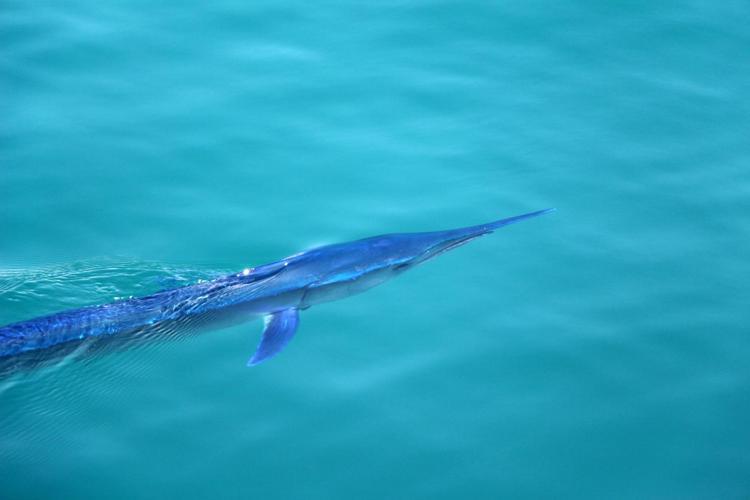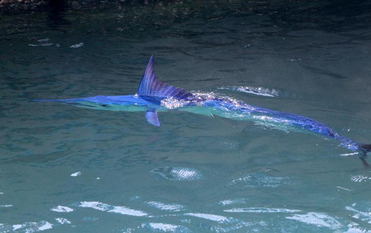 Dünyanın en hızlı deniz canlısı olarak Guinness Rekorlar Kitabı'na giren ve soyu tükenme tehlikesiyle karşı karşıya olan yavru mavi yelken balığı (Marlin Fish Spearfishing), Antalya'nın Kemer ilçesinde görüntülendi.